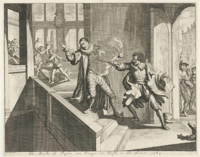 Wat mij dus opviel: Voordat Gerards opdook en de fatale kogels afvuurde, had hij goed contact gehad met het kamp van Oranje. Zo was hij op verzoek als koerier naar de hertog van Anjou in Frankrijk gereisd. Ook was hij degene die later de officiële brieven over Anjous overlijden overhandigde in Delft. Hij had Oranje er nota bene over bijgepraat, terwijl deze nog in bed lag. Schrijnend is het, dat Gerards zijn daad wist te realiseren dankzij middelen van de prins en diens entourage. Van Stipriaan schrijft op bladzijde 684 dat Gerards begin juli ‘het verhaal op[hing] dat hij, voordat hij naar Frankrijk terugkeerde, toch iets aan de representativiteit van zijn kleding moest doen.’ Hij kreeg daarop ‘een ruim bedrag’ om zich in het nieuw te steken. Dat was op 8 juli. ‘Van het geld kocht Gerards de volgende dag geen schoenen, maar twee pistolen. Hij kocht ze van een Frans lid van Oranjes lijfwacht, inclusief enige munitie.’ Een dag later, op 10 juli 1584, schoot Gerards Oranje dood. De lijfwacht, die de prins naar verluidt dertig jaar had gediend, pleegde zelfmoord.